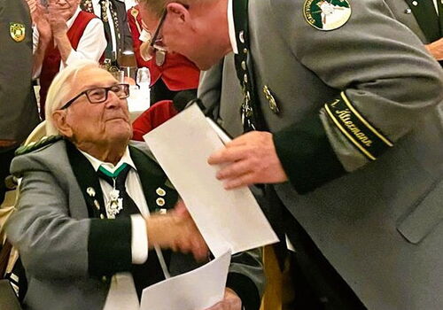 Bad SEgebergDas sehr seltene Jubiläum, 70 Jahre Mitglied zu sein, hat Egon Klatt bei der Stadtvogelschützengilde von 1595 Bad Segeberg erreicht. Der 93-Jährige ist ehemaliger Inhaber der Segeberger Eisenhandlung. So war es nicht nur für ihn, sondern auch für die 135 anwesenden Gildebrüder, Gildeschwestern und Gäste des Königsessens im Restaurant am Ihlsee eine große Überraschung, als Erster Ältermann Andreas Toebs diese außergewöhnliche Ehrung verkündete. Der Ältermann überreichte Egon Klatt das Ehrenkreuz in Gold des Norddeutschenschützenbundes, die Medaille in Gold des Deutschen Schützenbundes und eine Urkunde der Bad Segeberger Stadtvogelschützengilde. Zu diesen Ehrungen erhoben sich alle Anwesenden Gäste von ihren Plätzen und spendeten anhaltenden Applaus.