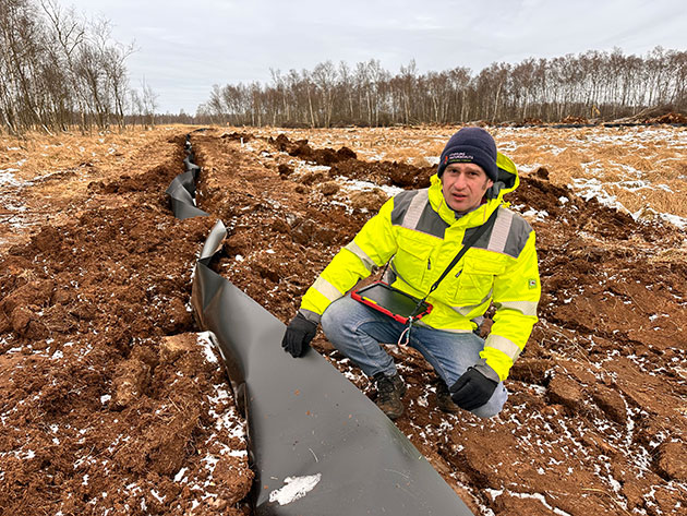 „Wir wenden diese Methode hier an, da wir so eine geringere Anzahl an Wällen aufschütten müssen und sie minimalinvasiv ist“, so Janis Ahrens. Der Dichtbahnpflug macht nur einen kleinen Schlitz in den Torf-Boden, der gleich hinter ihm wieder zu geht. „Das erleichtert uns nicht nur den Bauprozess, sondern schont die wertvolle Vegetation rechts und links der Dichtbahn“, betont er. Der erste Bauabschnitt umfasst 27 Hektar und soll bis zum Frühjahr fertig gestellt sein. Falls nicht, werden von März bis Ende August die Arbeiten unterbrochen und es kehrt Ruhe für die Brut- und Setzzeit der Moortiere ein. Im Herbst soll dann der zweite von insgesamt vier Abschnitten begonnen werden. 2029 soll alles fertig sein. Doch warum dieser enorme Aufwand?