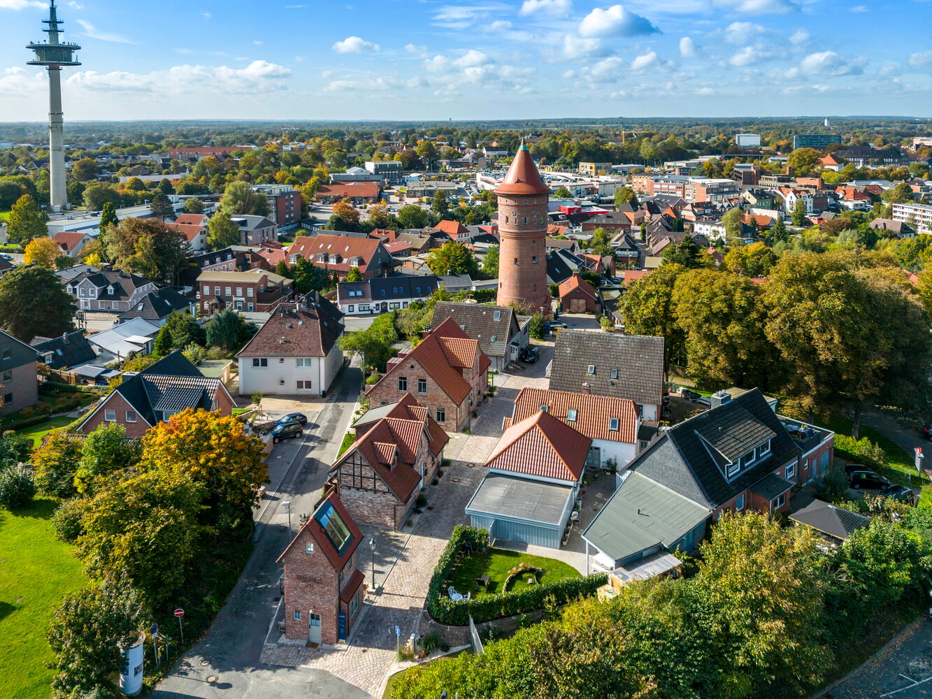Bad Segeberg Ein Hingucker ist der Wasserturm am Bad Segeberger Kalkberg das ganze Jahr über. Seit 2020 wird er auch touristisch genutzt. Über sechs Etagen stehen Hotelgästen sechs exklusiv gestaltete Doppelzimmer zur Verfügung. Der Wasserturm steht im Mittelpunkt des Apart Hotels, eine attraktive Unterkunft mit viel historischem Flair. In der Vorweihnachtszeit erstrahlt er feierlich im Lichterglanz.